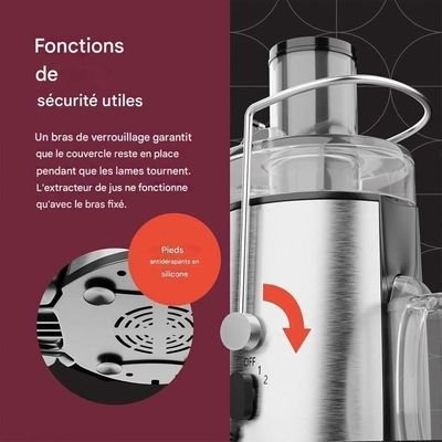 Puissance : 450W; Rendement en jus : 60%-70%; Ouverture d’alimentation : 70 mm; Capacité : Récipient à jus (500 ml) Pulpe de fruits (1,2 litre); Vitesse : La vitesse « I » avec la rotation de 12 000 RPM à 15 000 RPM est pour les fruits mous, tels que la myrtille, la pastèque et l’orange. La vitesse « Ⅱ » avec la rotation de 15 000 RPM à 18 000 RPM est pour les fruits durs, comme les pommes, les carottes et le céleri. « * » Indique que la vitesse la plus élevée est toujours maintenue(18 000 RPM), la vitesse s’arrêtera lorsque vous relâcherez votre doigt. Matériau : Acier inoxydable; Dimensions : 27x19x34.5cm; Couleur : Gris. Equipé d’un bras de verrouillage et d’un dispositif de protection contre la surchauffe (la machine cessera de fonctionner si la température dépasse 105℃). Usages recommandés pour le produit : Chou frisé, Grenade, Poire, Carotte, Gingembre, Concombre, Pomélo, Céleri, Herbe de blé, Raisin, Pamplemousse, Pastèque, Betterave. Remarque : L’unité principale de l’extracteur de jus ne doit pas entrer en contact avec l’eau, car cela provoquerait un dysfonctionnement et la rendrait inutilisable.